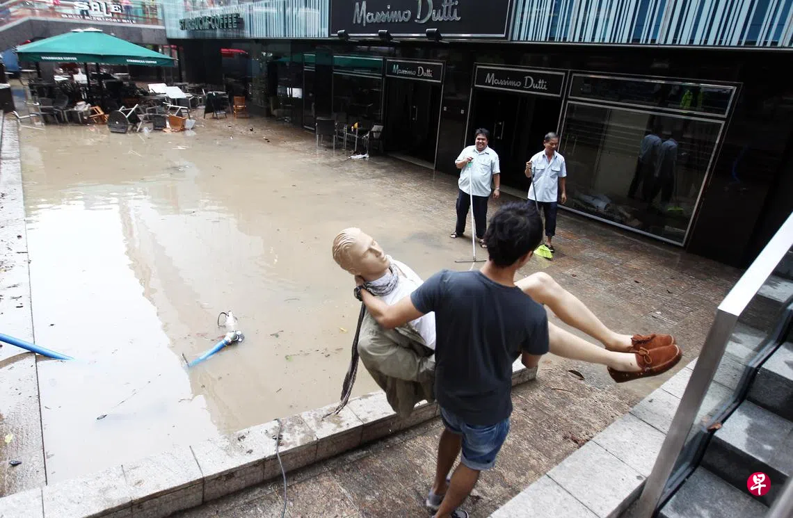 图中的烈大厦(Liat Tower)当时因大量雨水灌入地面层店铺,商家被迫暂时关店。雨停后,员工们忙着清除大水带来的落叶、塑料袋等杂物和垃圾;有人把被水冲倒的橱窗模特儿抱回店内。