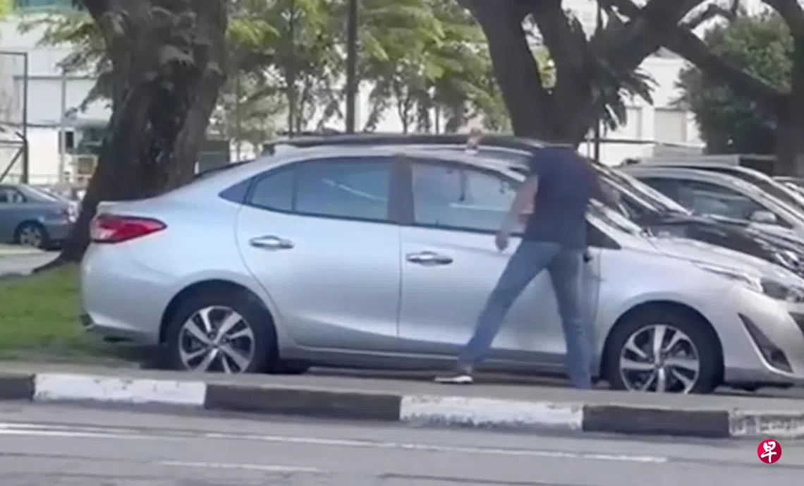 社媒Sgfollowall也在社交媒体平台发视频,画面显示一名穿着蓝色上衣和牛仔裤的男子正在用手将不明物体涂抹在一辆银色汽车上。随后男子用力把不明物体甩到车身就走掉。