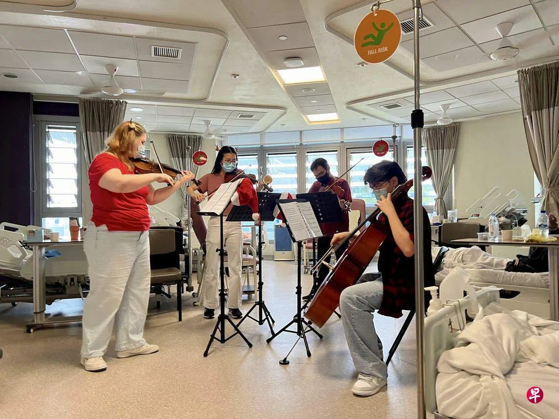 另外,亚历山大医院的住院年长病患,也在女皇镇尤克里里兴趣小组义工的弹唱歌声中迎来圣诞。与平日里千篇一律的浅色口罩相比,鲜艳的红色圣诞帽为病房增添一抹活力,圣诞歌谣欢快的旋律也为卧床病患驱散沉闷。
