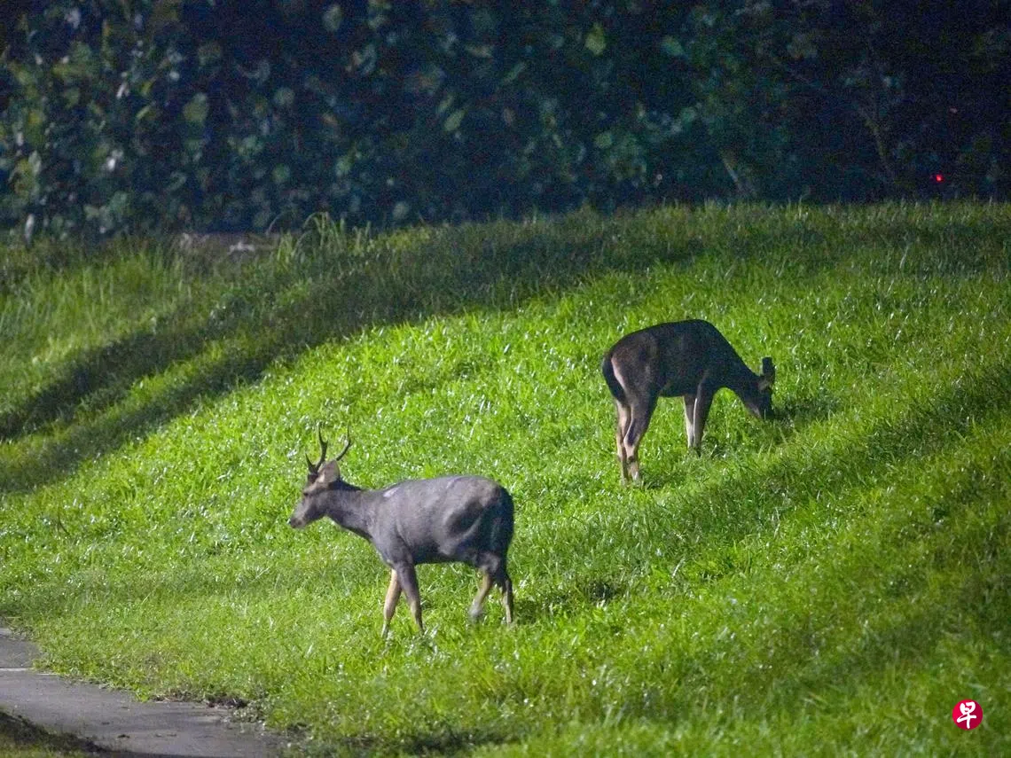 圣诞节前夕(24日)凌晨2时,《联合早报》高级摄影记者何家俊在万礼一带的中央集水地带自然保护区,守候两个多小时,终于皇天不负有心人,让他等到两只水鹿从灌木丛钻出来,罕见地待在路边草地吃草。