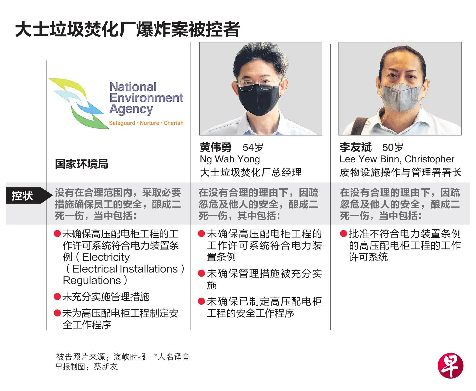星期二被控的是环境局,以及环境局废物设施操作与管理署署长李友斌(50岁)和大士垃圾焚化厂总经理黄伟勇(54岁),各被控一项抵触工作场所安全与卫生法令的罪状。相信这是事件发生两年多以来,第一次有机构或人员因此被控。