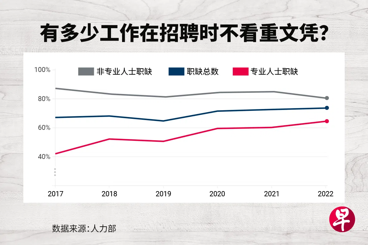 人力部2022年的数据显示,本地招聘专业人士(PMET)的职缺当中,有64.5%不再把文凭看作最重要的指标,比2017年的42%高出许多,这说明有更多的招聘者不再看重文凭。但这是否意味着,考取大学文凭已不那么重要了?