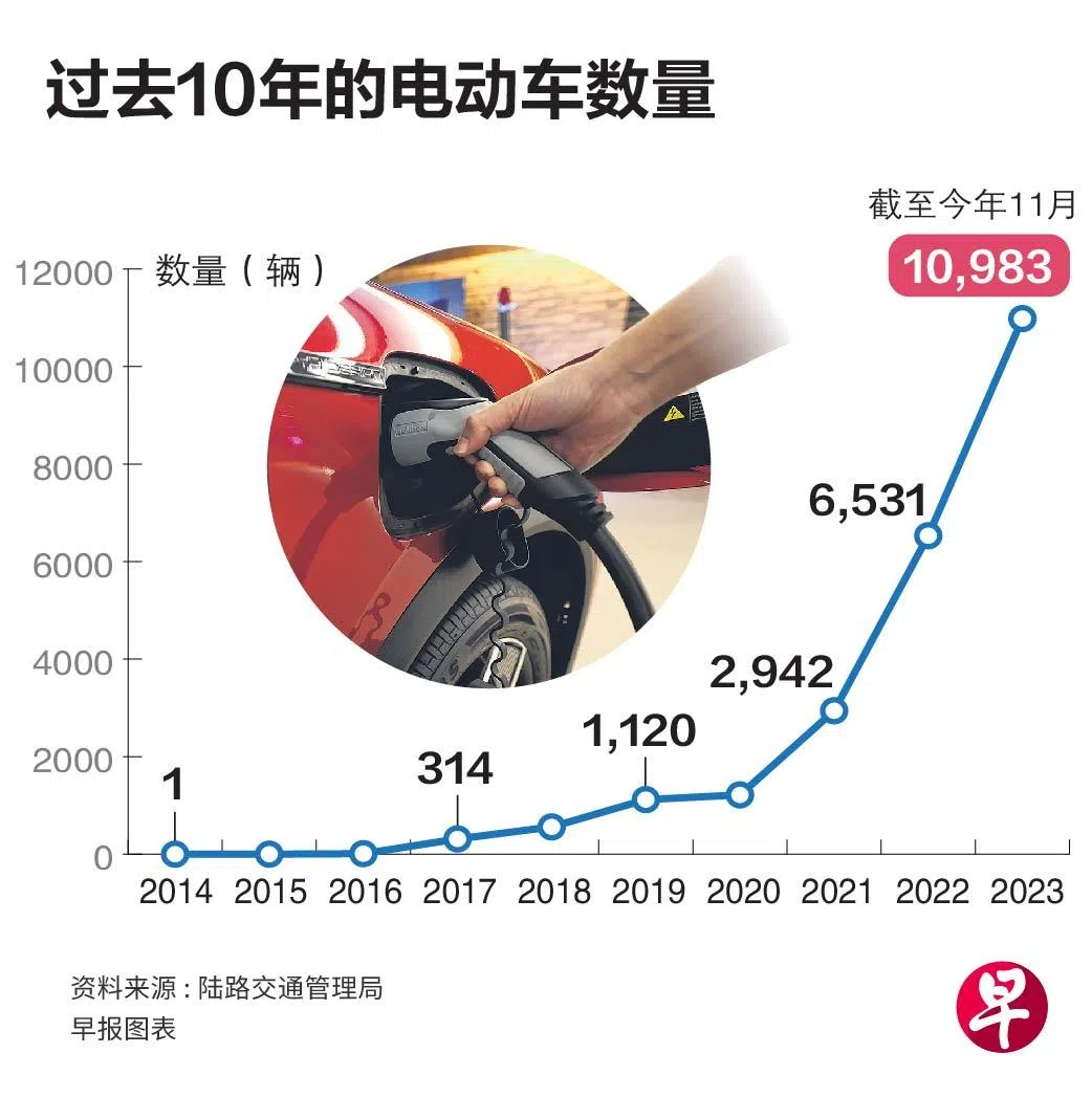 根据陆路交通管理局网站数据,我国截至11月共有1万零983辆电动车,比2022年的6531辆增加了68.2%。不过,在我国近65万辆轿车中,电动车仅占1.69%。