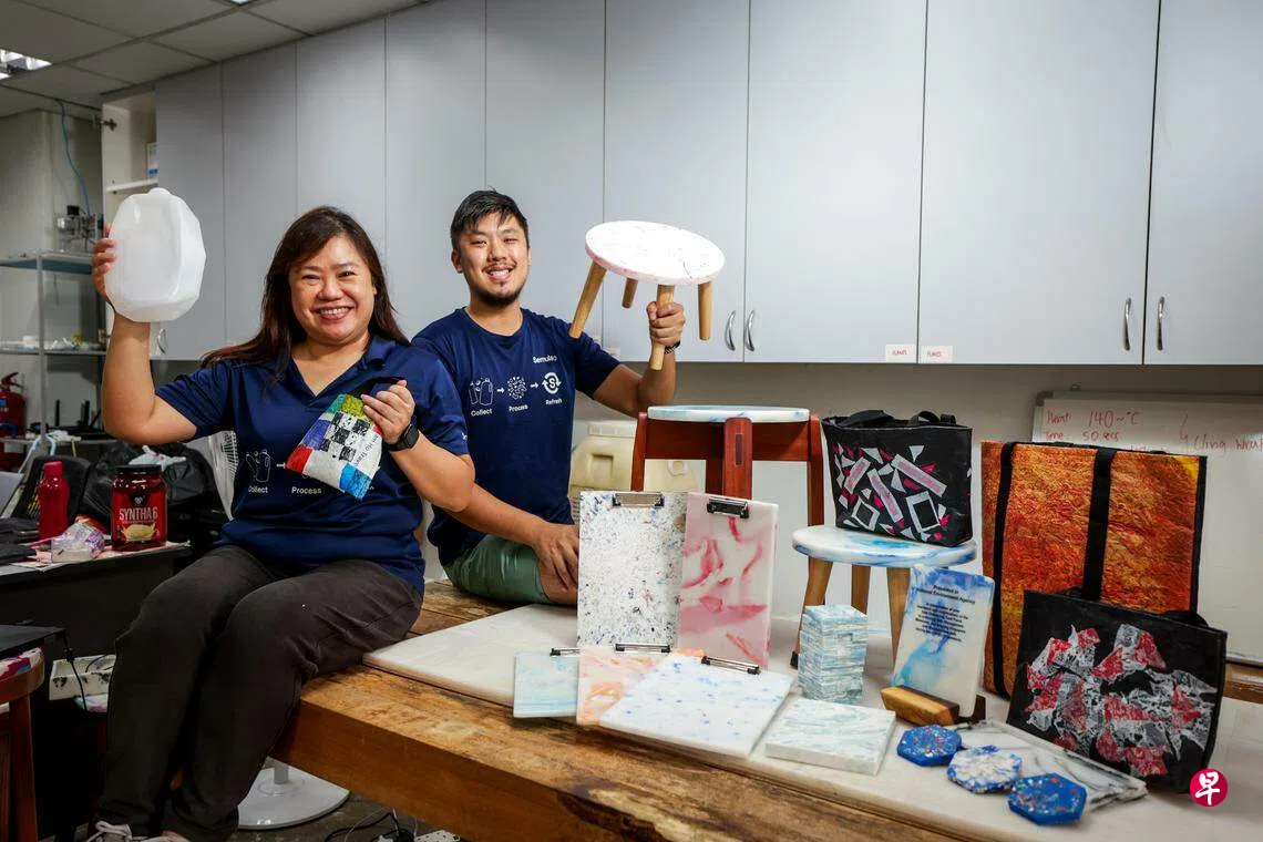 为了减少本地的塑料垃圾,环保企业Semula专门收集咖啡店的牛奶罐进行升级再造,每月可回收约110公斤的塑料,制作成杯垫、桌子、板凳等家居用品。