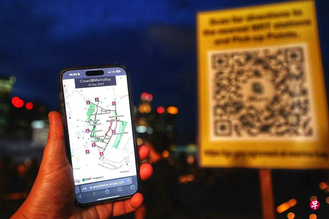 从12月31日傍晚7时起,公众可上网https://go.gov.sg/crowd-at-marina-bay,或用手机扫描警方在滨海湾一带张贴的QR码看板,查看实时地图。