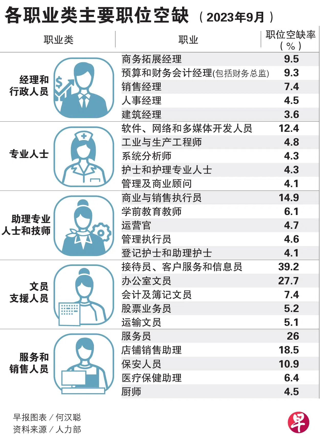 以类别来看,经理和行政人员类别职缺比率最高的属商务拓展经理、预算和财务会计经理和销售经理。在专业人士当中则是软件、网络和多媒体开发人员、工业和生产工程师,以及系统分析师。助理专业人员和技术人员类别中,职缺比率最高的则是商业与销售执行员、学前教育教师和运营官员。