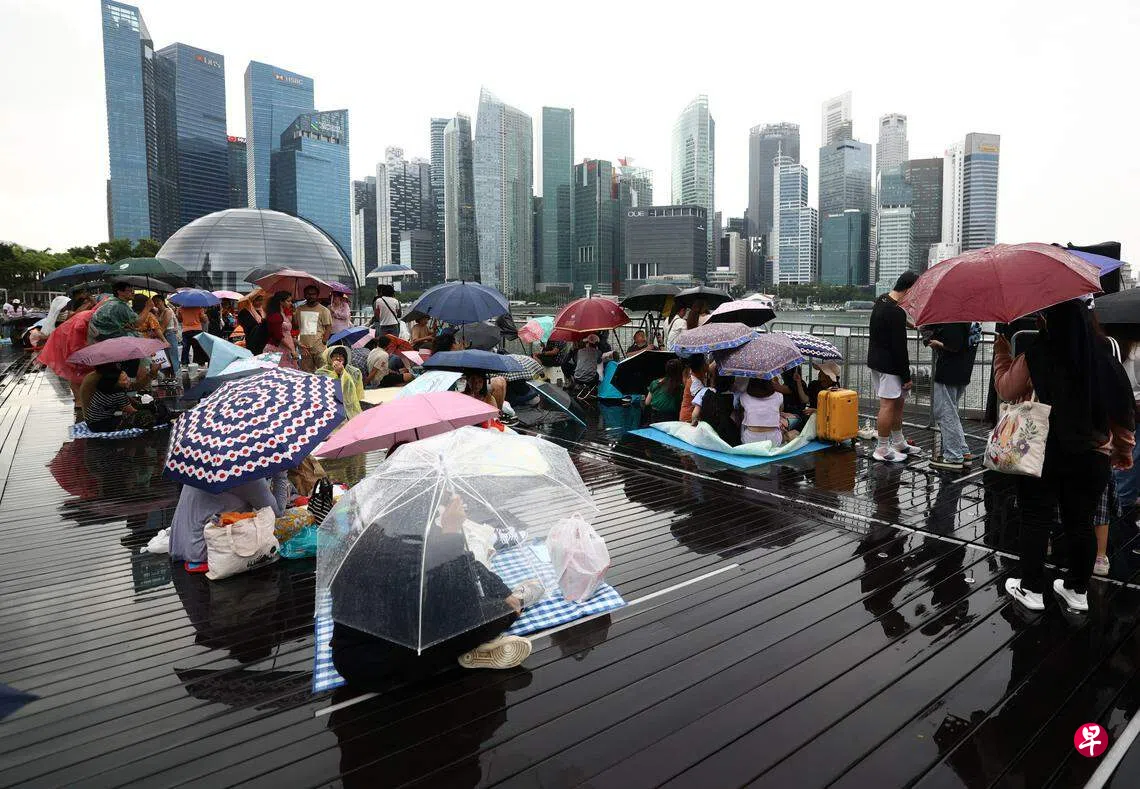天公不作美,许多公众对跨年烟花汇演的期待不减。随着雨势在元旦前夕傍晚渐小,上千名公众陆续从四面八方涌至滨海湾,铺好野餐垫、竖起三脚架,撑着雨伞等待新年到来。