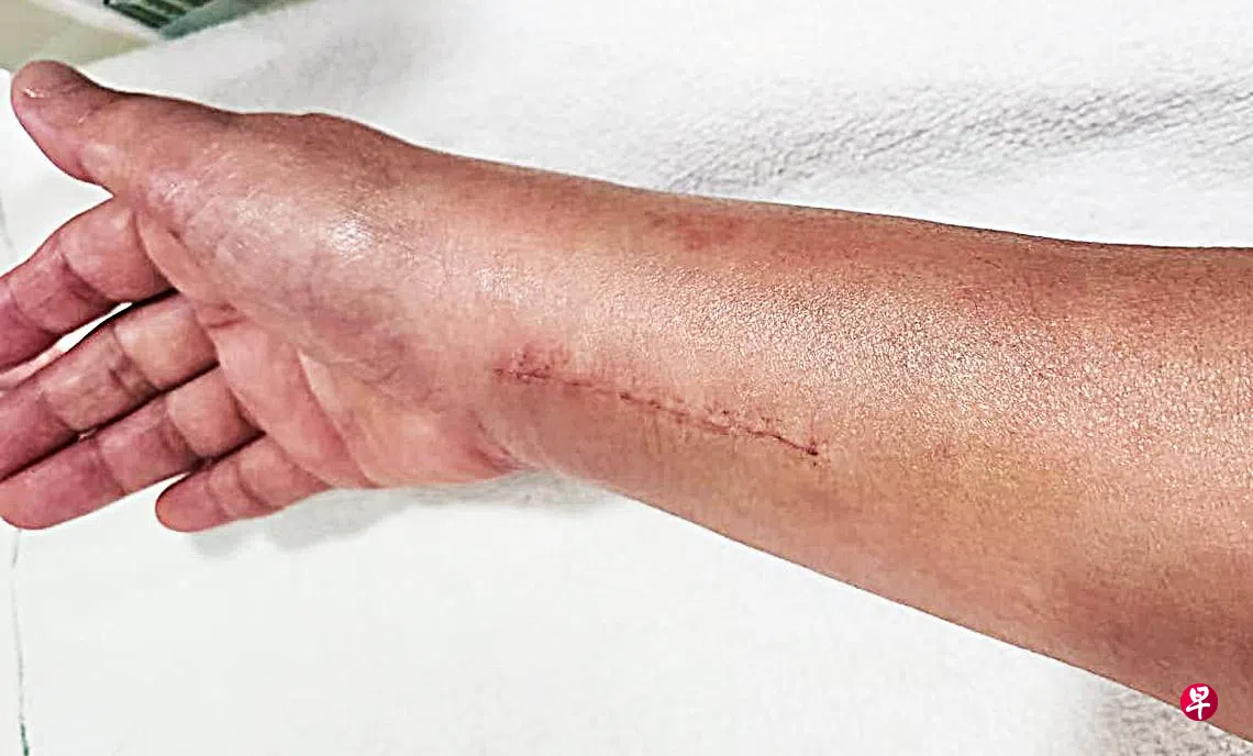她说,由于紧握把手,当时前轮被撞后右手已呈弯曲状,之后摔落在地时再次伤及右手,导致右手腕严重骨折,下巴、脚和其他部位多处受伤,被送进医院后还动了手术并住了一天。