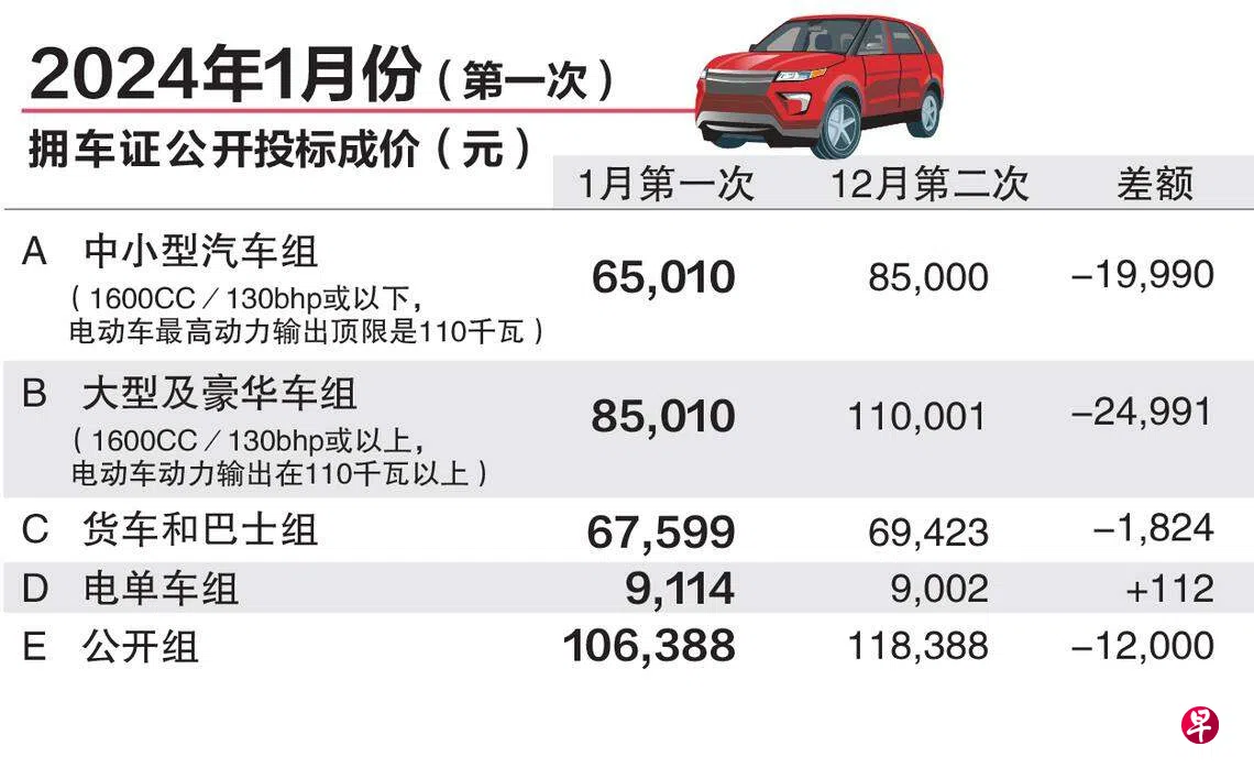 2024年首轮拥车证公开投标活动星期四(1月4日)下午结束,应对大众市场需求的中小型汽车组(A组)成价下降1万9990元(23.52%),报6万5010元。