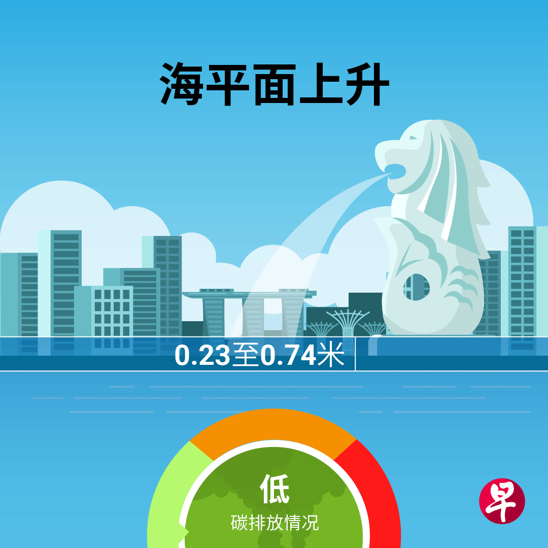 根据2015年发布的第二次全国气候变化研究结果,到2100年,在中度和高度碳排放的情况下,新加坡周围的平均海平面预计会上升0.33至1.05米。
