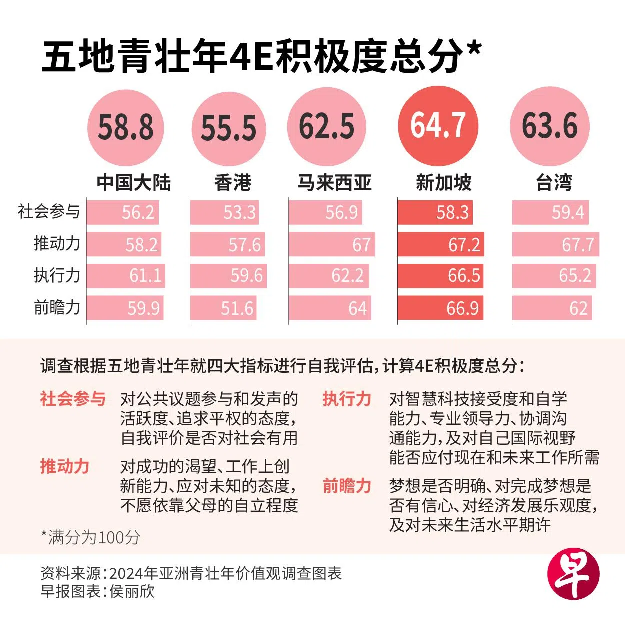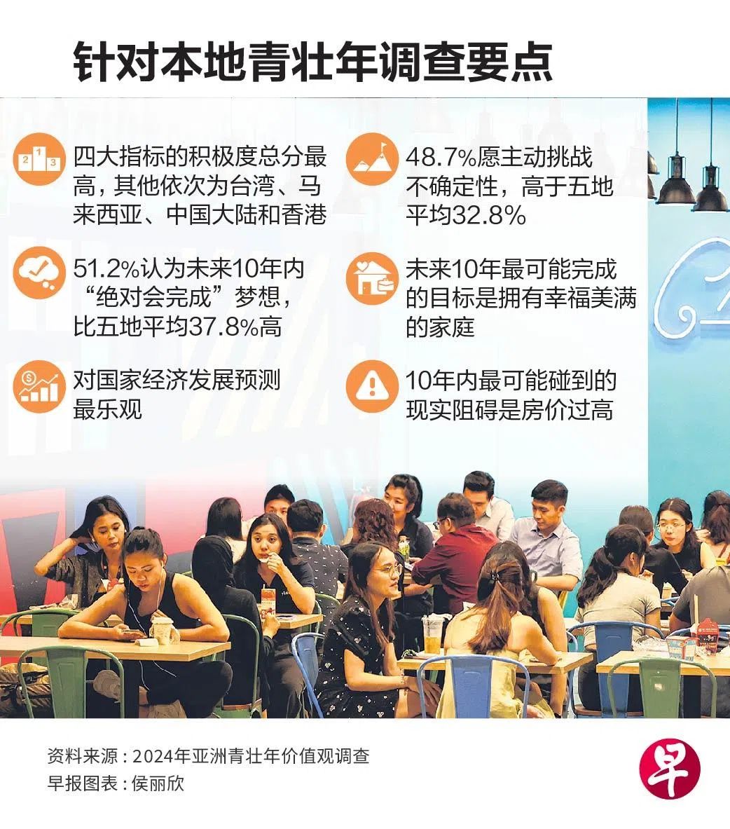 “2024年亚洲青壮年价值观调查”这项横跨中港台及新马的大型网络问卷调查发现,新加坡18岁至45岁的青壮年不仅拒绝“躺平”,冒险精神以及运用智慧科技的信心也最强,整体上对生活、工作的态度最积极。