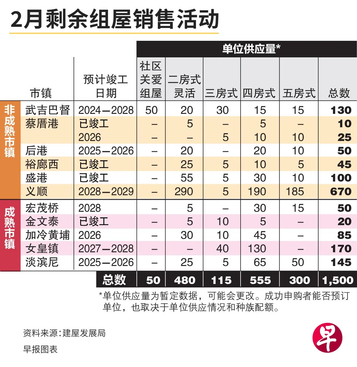 建屋发展局2月将推出约4100个预购组屋单位和约1500个剩余组屋单位,其中近半数剩余组屋位于义顺。当局鼓励有意参与本轮活动的购屋者,尽早申请购屋资格通知书,并在1月15日前提交所有所需文件。