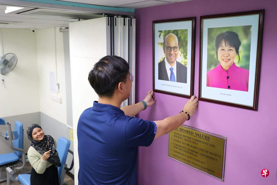 马西岭选区办公室职员星期四(1月11日)踏上梯子,在马西岭第三分区居民联系网的墙上张挂尚达曼总统和夫人珍一藤木的肖像。他们认真调整相框,确保高度一致、不偏不倚,以示尊敬。
