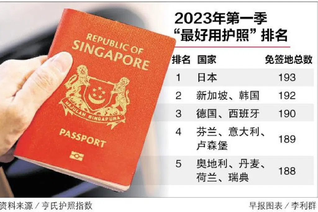 在2023年的亨氏护照指数中,新加坡护照以193个免签地独居排行榜首位,其次是拥有192个免签地的日本护照。