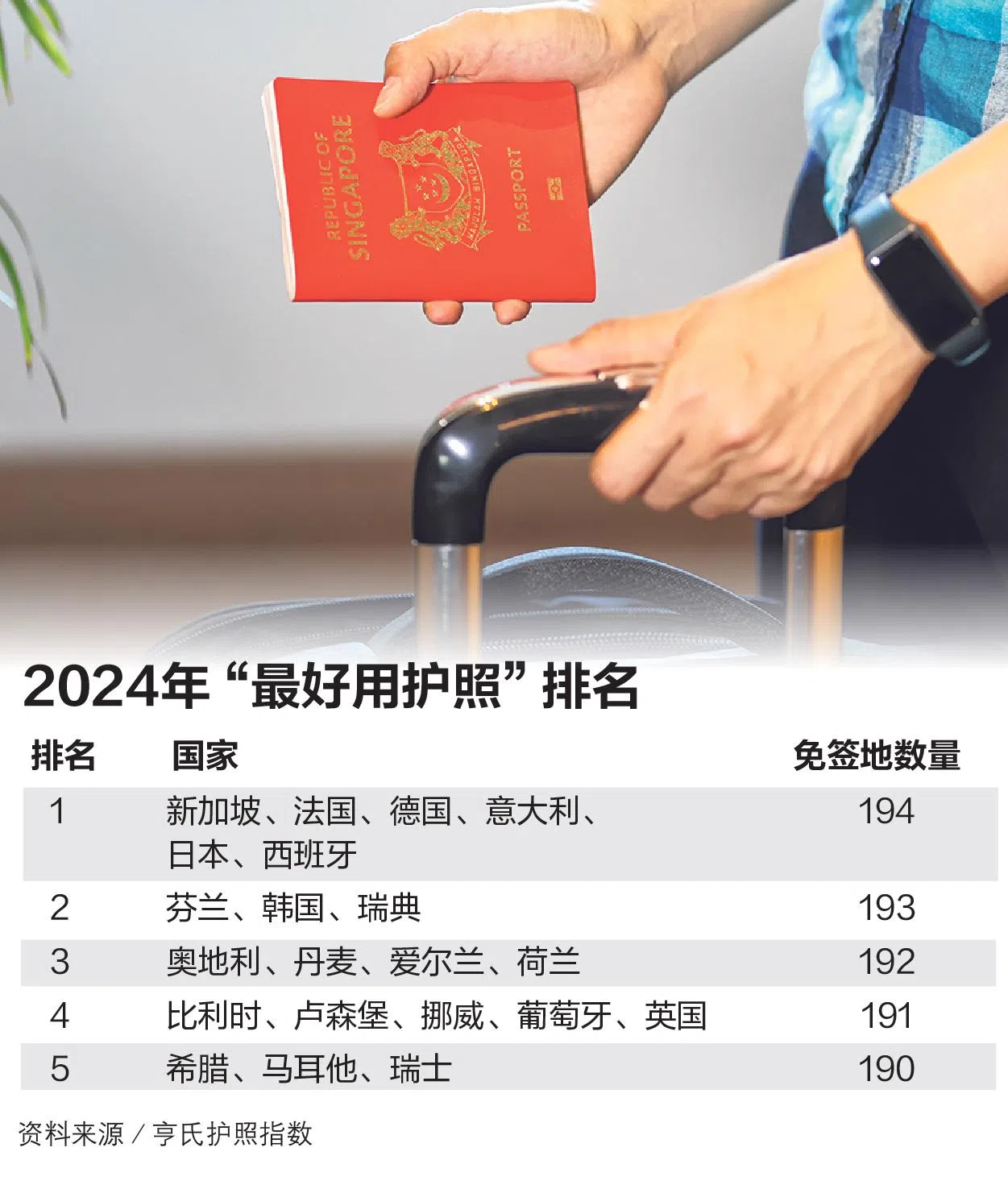 根据伦敦顾问公司亨利及合伙人(Henley & Partners)公布的2024年亨氏护照指数(Henley Passport Index),新加坡与法国、德国、意大利、日本和西班牙并列榜首,在227个旅行目的地中都各享有194个免签地。