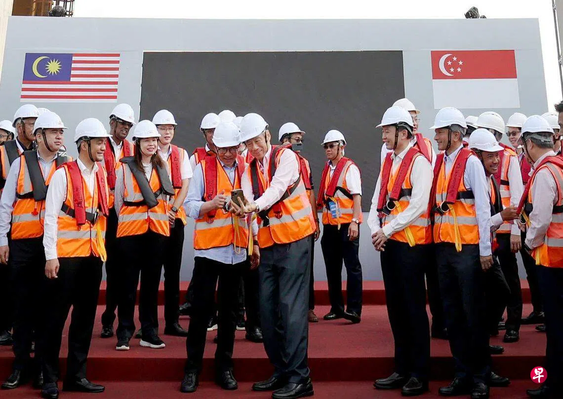 新柔地铁工程星期四步入另一个里程碑,李显龙总理与马国首相安华在柔佛海峡中央,共同见证新柔地铁跨海高架轨道完成衔接。