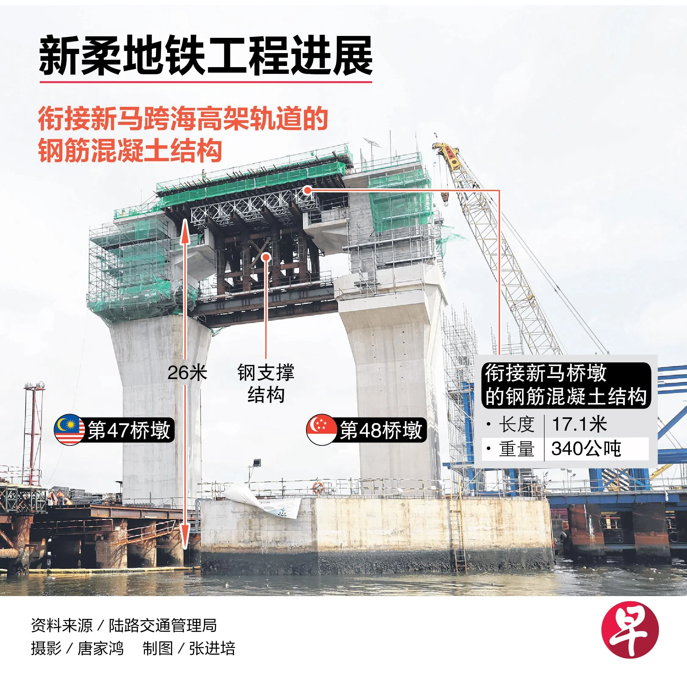 衔接新马跨海高架轨道的钢筋混凝土结构长17.1米、重340公吨,横跨马国和新加坡分别负责建造的第47和第48桥墩,于去年12月底完工。