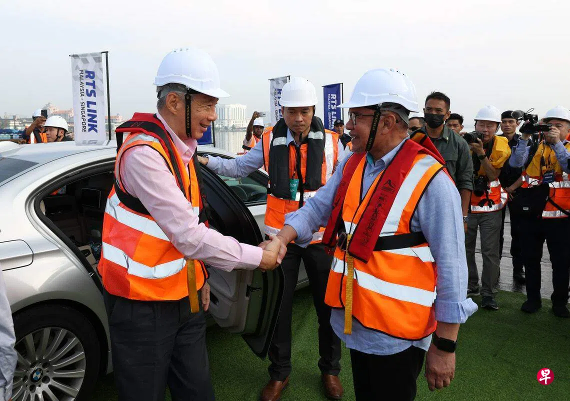 李显龙总理和马来西亚首相安华,11日在柔佛海峡中央一起参加新柔地铁跨海高架轨道的衔接仪式。两人签署了未来将挂上47号和48号桥墩的纪念牌匾,象征两国对完成这个项目、进一步改善新马衔接性的共同承诺。
