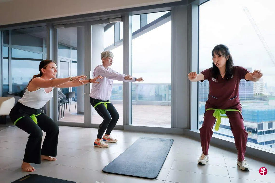 国大医院首席物理治疗师蔡家齐说,适当的力量训练可以帮助缓解更年期关节疼痛。“这些动作,如下蹲、靠墙俯卧撑等,都可以居家完成,每个动作做八到12次为一轮,重复三轮。”