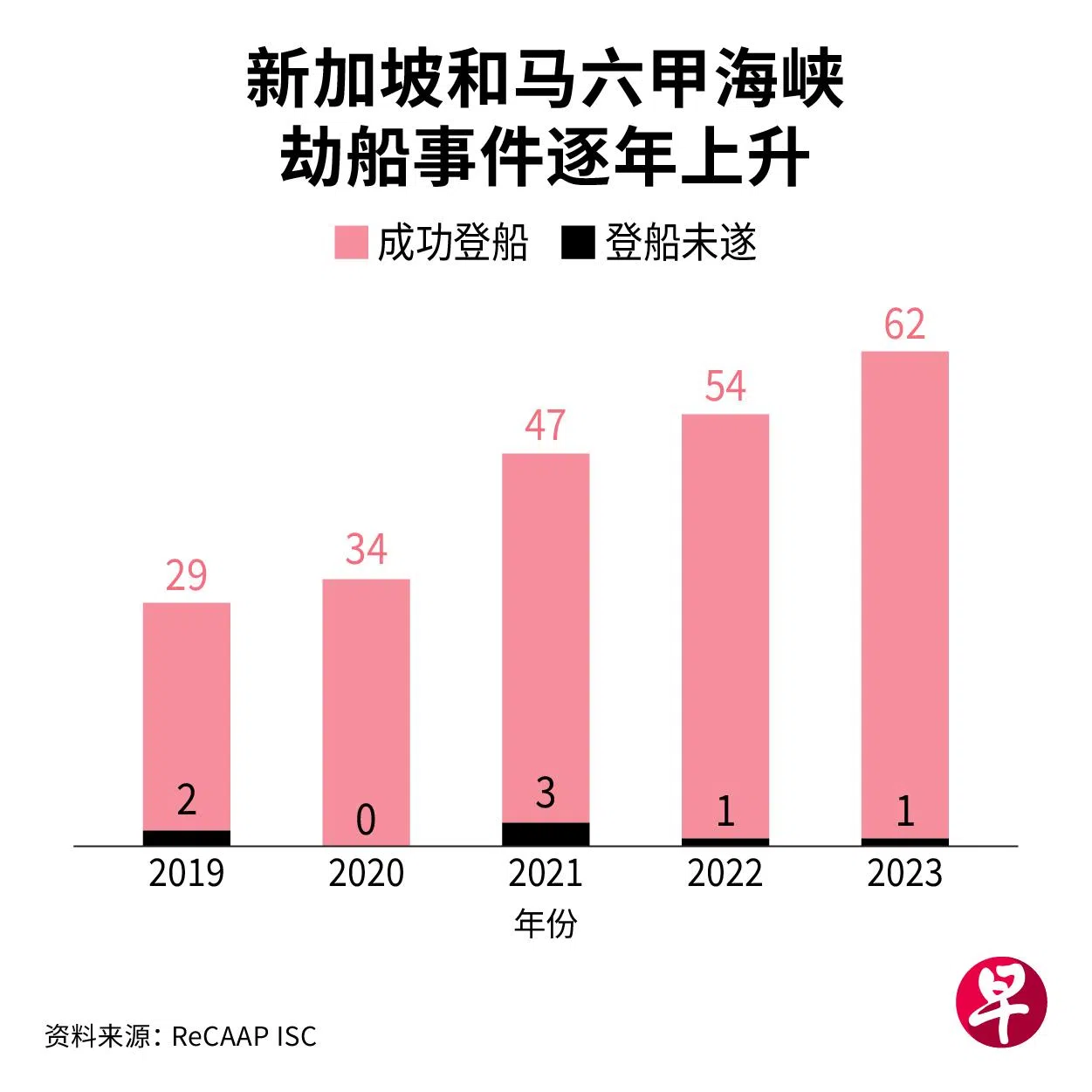 新加坡和马六甲海峡去年共发生63起劫船事件,比前年的55起增加约12%。其中,58起发生在新加坡海峡,马六甲海峡前年没有这样的事件,去年却有五起,情况令人关注。