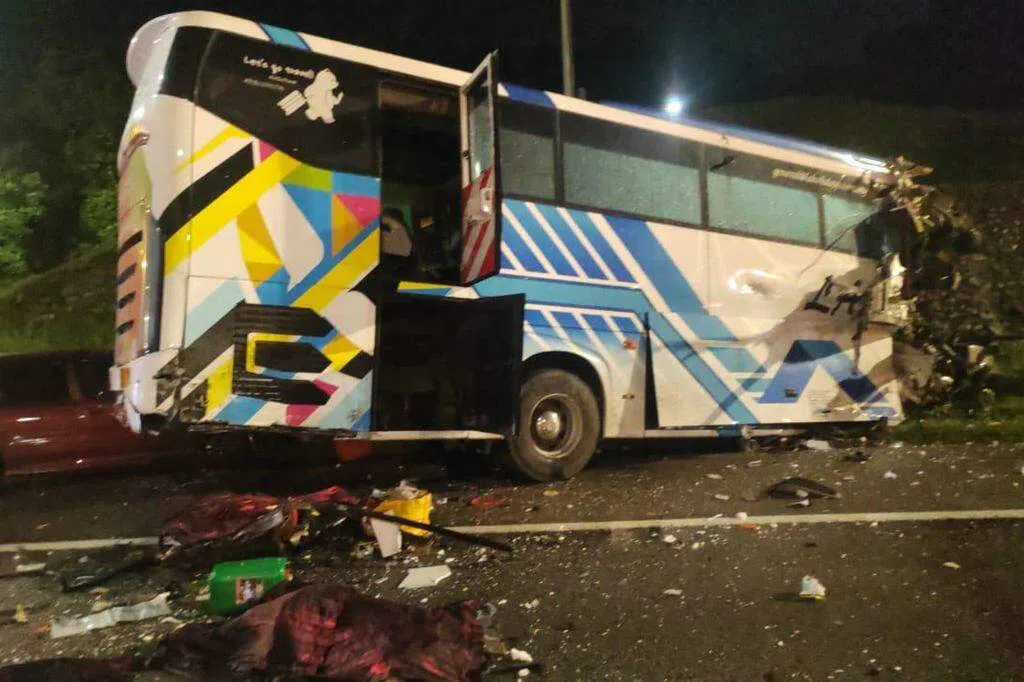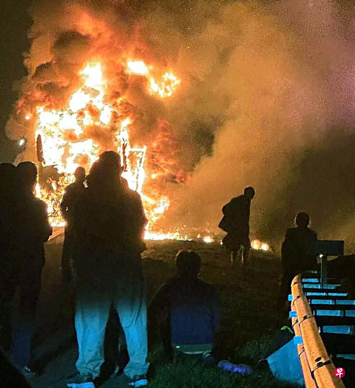 《新明日报》星期六(1月13日)报道,一辆从本地出发前往马来西亚吉隆坡的长途巴士,在星期六凌晨3时许,途经南北大道北向第198公里处,与一辆疑因失控摔倒在路上的电单车撞上,并拖行一段路后起火燃烧。巴士上当时载有30人,包括两名司机和28名乘客。
