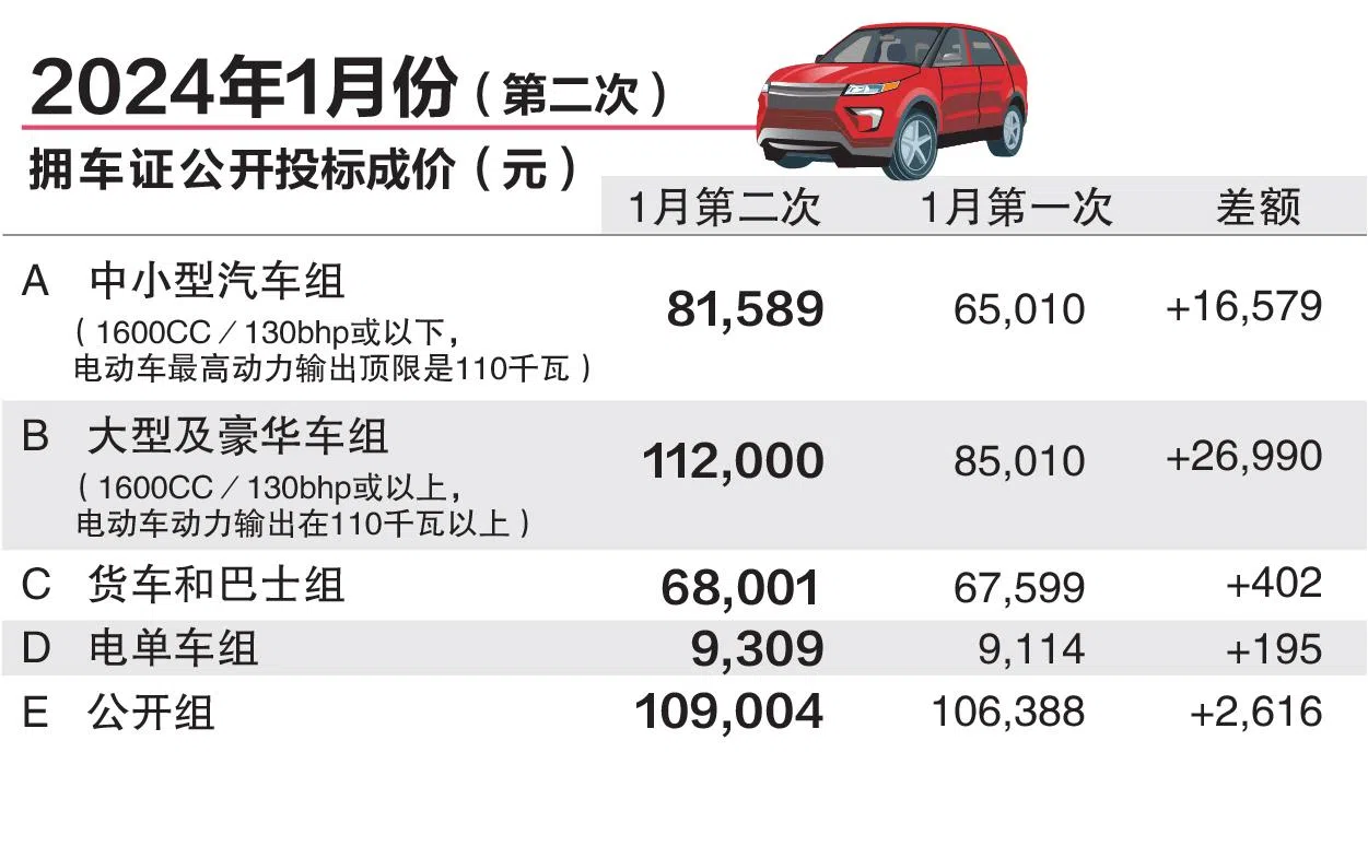 1月第二轮拥车证公开投标活动星期三(1月17日)下午结束,应对大众市场需求的中小型汽车组(A组)成价上涨1万6579元(25.5%),报8万1589元。
