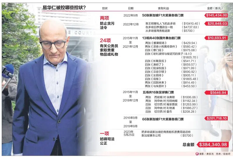 易华仁被指索取的贪污利益包括在2022年12月搭乘王明星的私人专机前往卡塔尔首都多哈,以及新加坡赛车公司支付他飞回新加坡的商务舱机票费用;在多哈期间,让王明星为他下榻四季酒店买单,一晚开销约4737元。易华仁也被指向王明星索取2022年新加坡F1赛事共50张不同等级的门票,总值14万5434元。