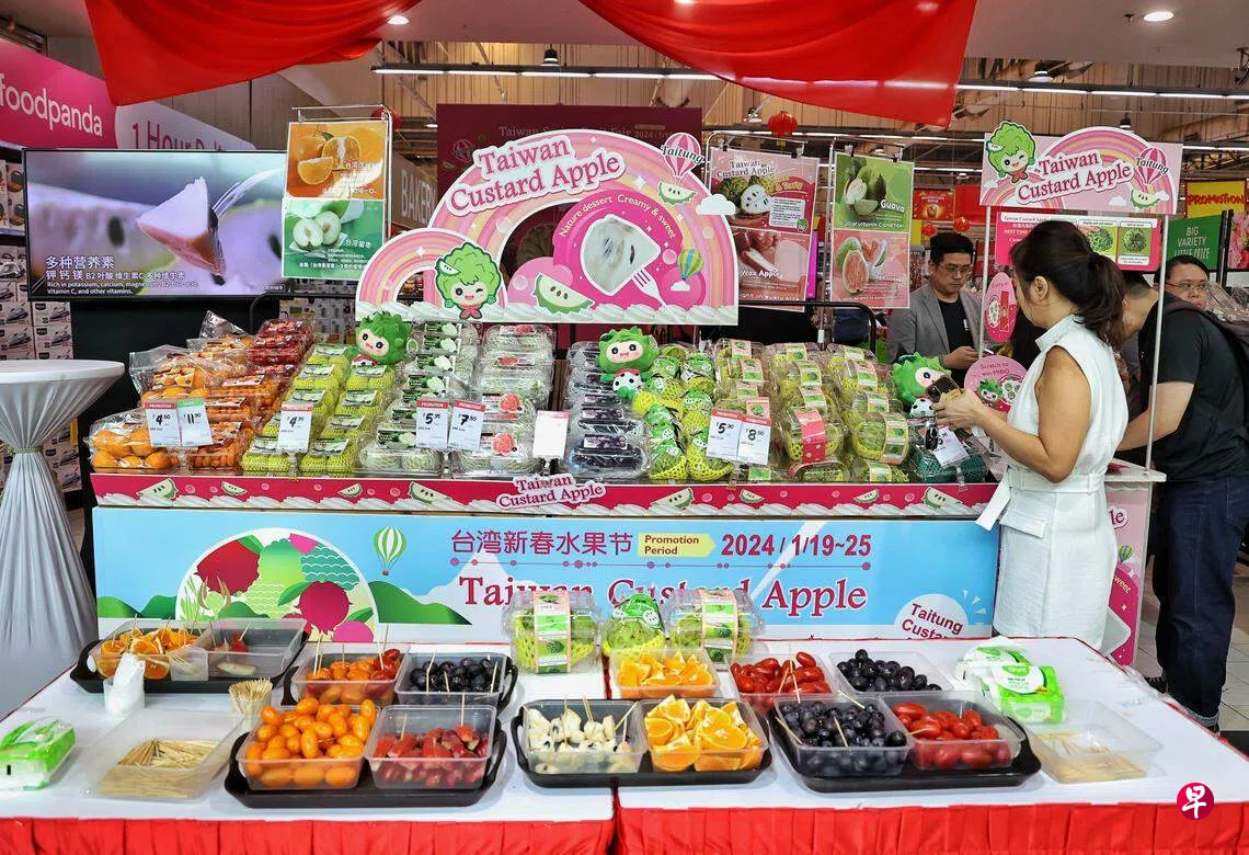 由本地巨人超市和驻新加坡台北代表处等单位合办的台湾新春水果节,星期五(1月19日)正式拉开帷幕。一周的活动期间,DFI零售集团旗下的六家巨人超市将以促销价,售卖台湾台东的凤梨释迦(Atemoya custard apple)、茂谷柑、蜜枣、番石榴、红心番石榴、巨峰葡萄与莲雾等。