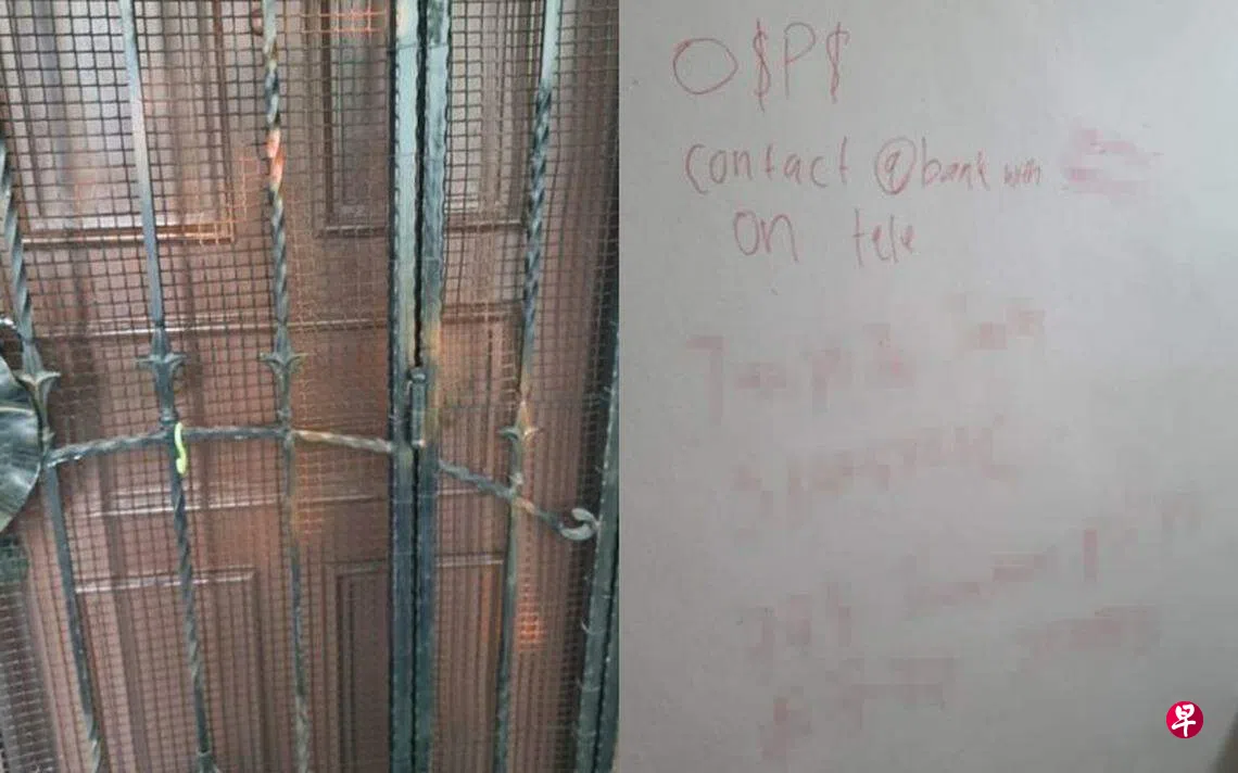 调查显示,淡滨尼71街的一个组屋单位外被人泼了红漆,楼梯间的墙壁也被写上追债字眼。