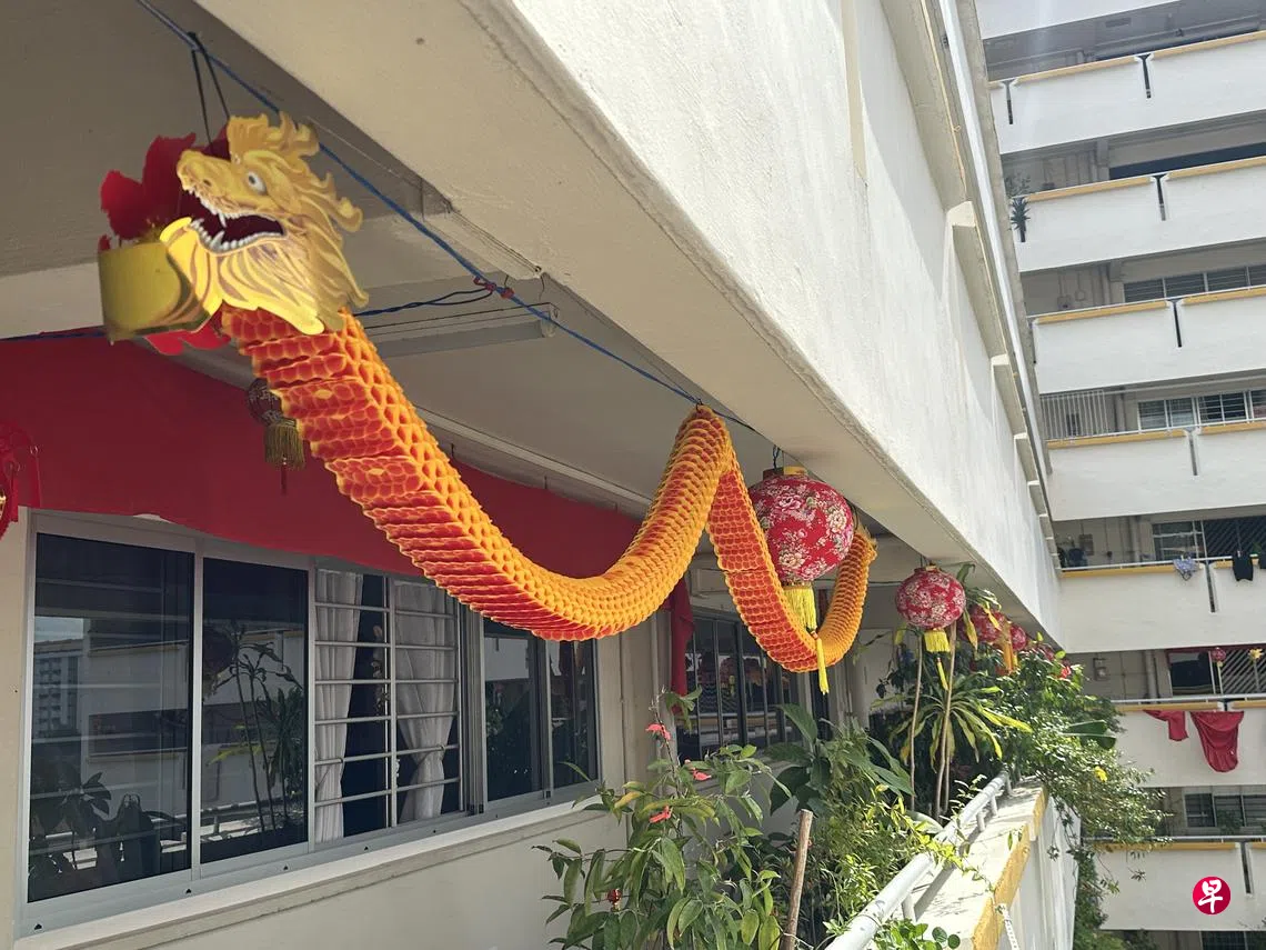 腊月十五还没到,跑马埔路第681座组屋的七楼就已洋溢着浓厚的农历新年气氛。住在这一层的九户邻居,已经在走廊张贴春联,挂起红灯笼,还吊起了八只象征吉祥的龙形装饰。