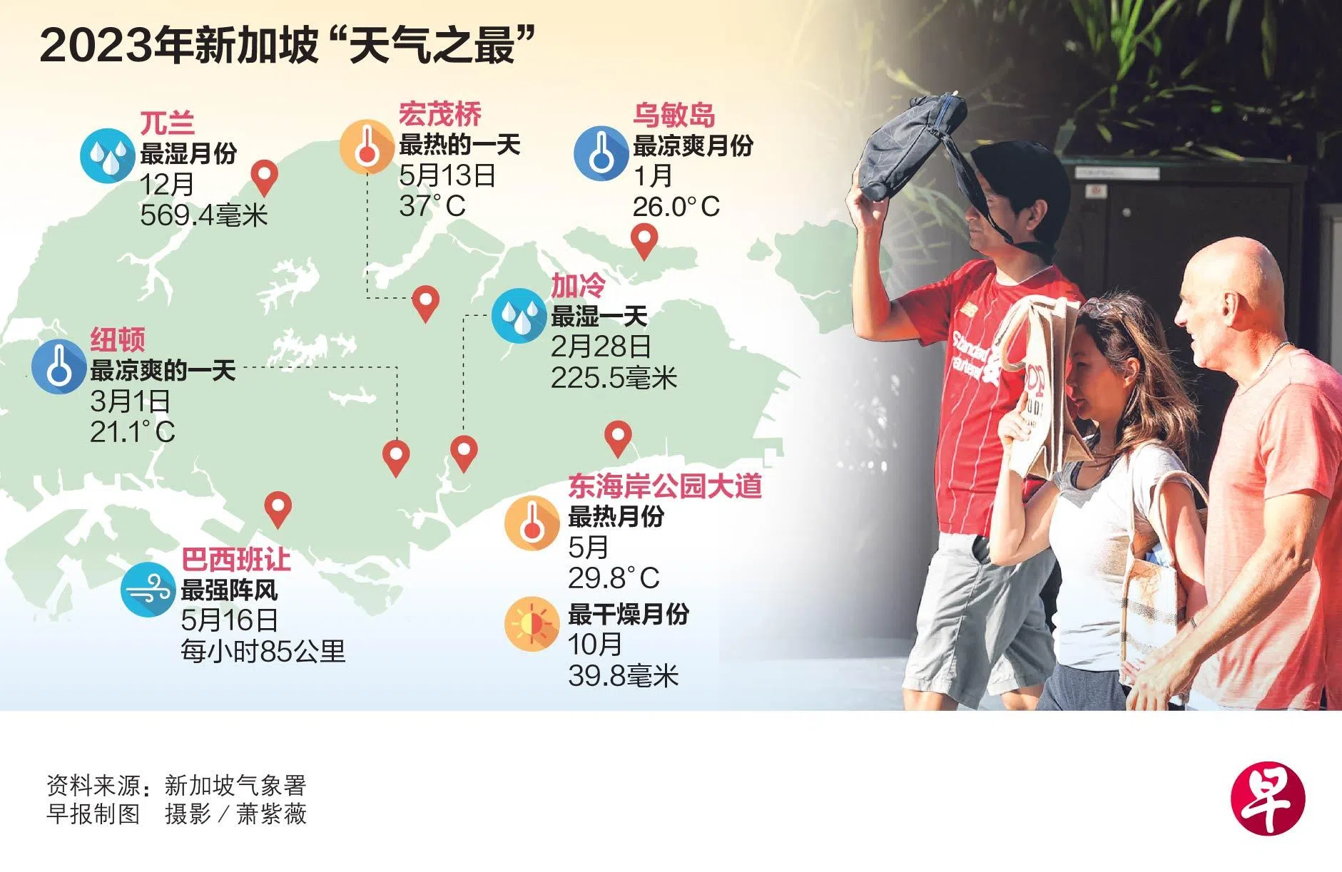 根据新加坡气象署星期一(1月22日)发布的《新加坡气候:从数字看2023年》报告,2023年的平均气温是28.2摄氏度,与1997年和2015年相同。我国有记录以来最热的是2019年和2016年,这两年的平均气温都是28.4摄氏度,其次是1998年的28.3摄氏度。