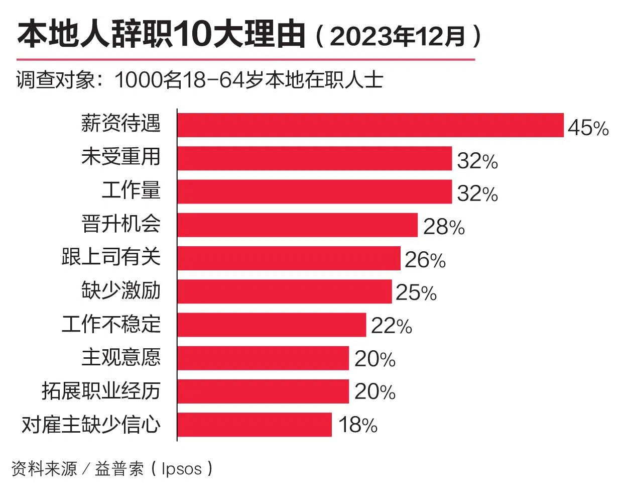 调查还发现,薪资待遇、未受重用、工作量大是本地受访者跳槽的三大原因。