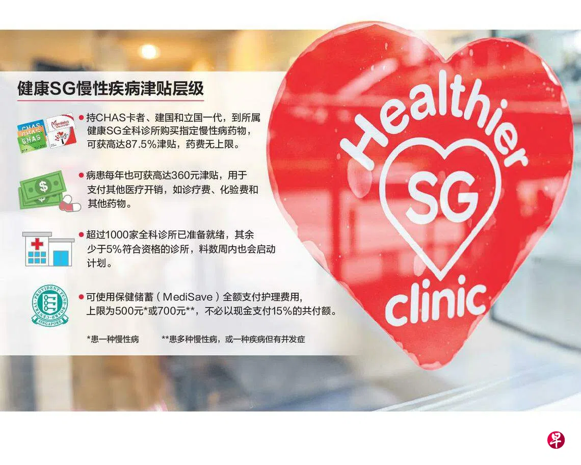 此外,从下星期四起,患有慢性疾病管理计划所列出的慢性疾病,并已加入健康SG计划的本地居民,在所属健康SG全科诊所求诊时,可不必以现金支付相当于费用15%的自付额(co-payment),他们能选择用公积金保健储蓄来付全额,只要款额不超出每年的500元或700元(MediSave500/700)提取顶限。