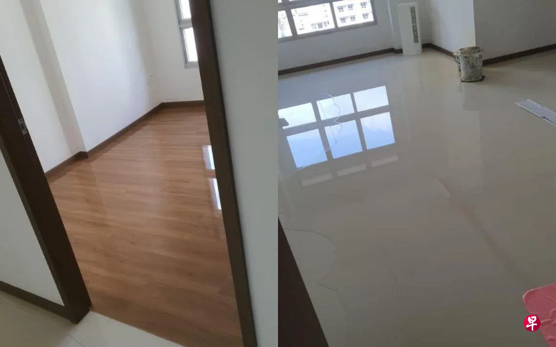 叶女士(47岁,自雇人士)向《新明日报》申诉,自去年11月28日拿到登加Plantation Grange第131B座组屋的四房式单位钥匙后,12月5日去看单位时,发现大门外与房间的地上有漏几滴水,之后甚至变成一摊水。