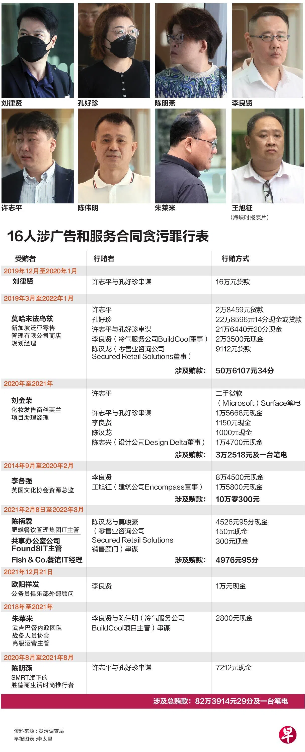 过去九年多涉嫌贪污或欺诈,以促进自家公司广告和服务合同的利益,16名公司董事、股东或经理等人被控上庭,涉案总金额逾82万元。其中,一家公司经理在四年内收取四人超过50万元利益。