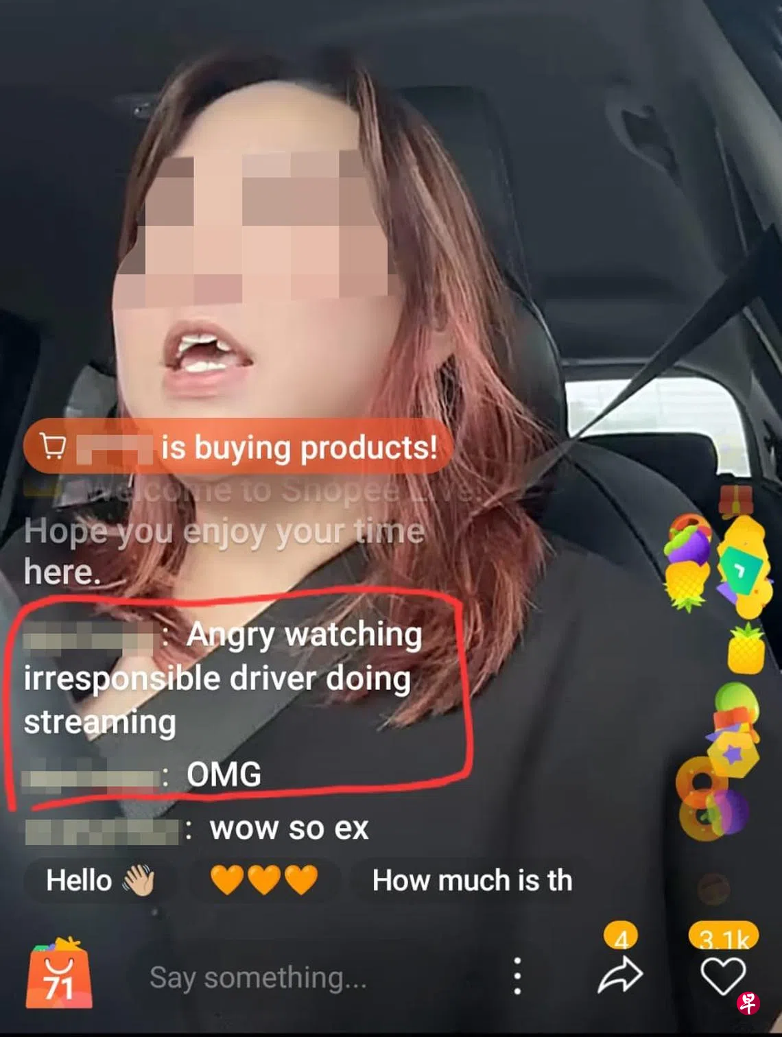 公众陈女士(40岁)告诉《新明日报》,她1月20日在网购平台虾皮观看直播时发现,一名女播主一边开车一边直播。“她当时在推销新年饼干,一边说话,一边开着车。”