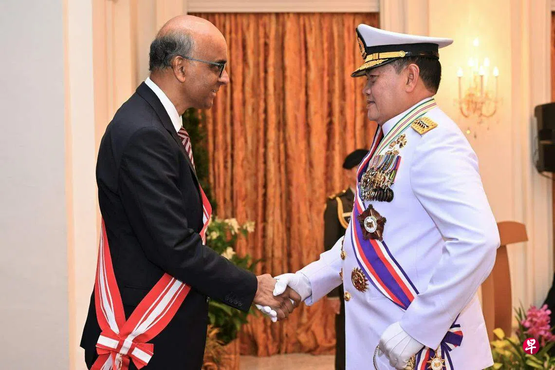 尚达曼总统颁发象征新加坡最高军事荣誉的殊功(军事)勋章,给印度尼西亚国家武装部队前首长尤多(Yudo Margono),表彰他在强化两国军队关系方面的卓越贡献。