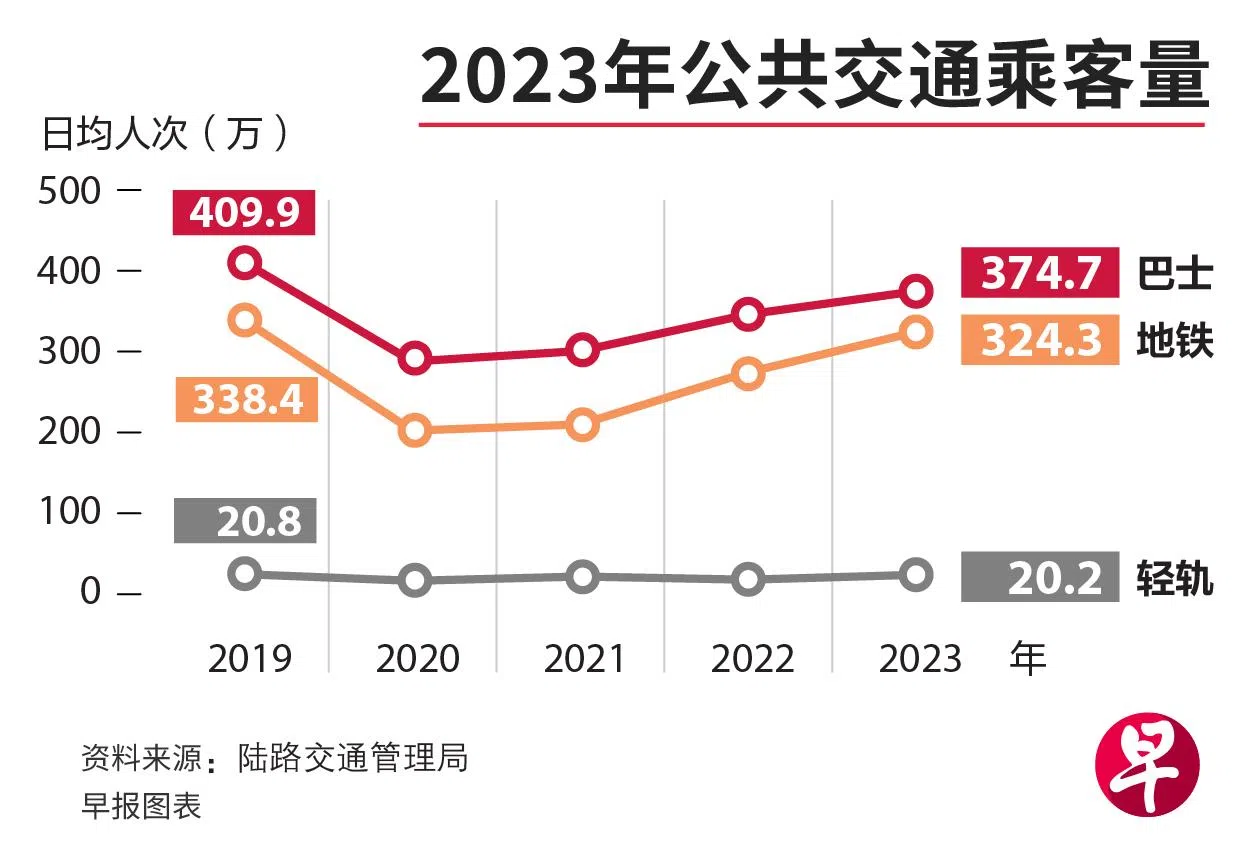 公共交通包括地铁、轻轨和公共巴士服务。陆路交通管理局星期三(1月31日)公布的最新数据显示,2023年的公交日均总乘客量达719万2000人次,高于2022年的639万人次,增幅为12.6%。