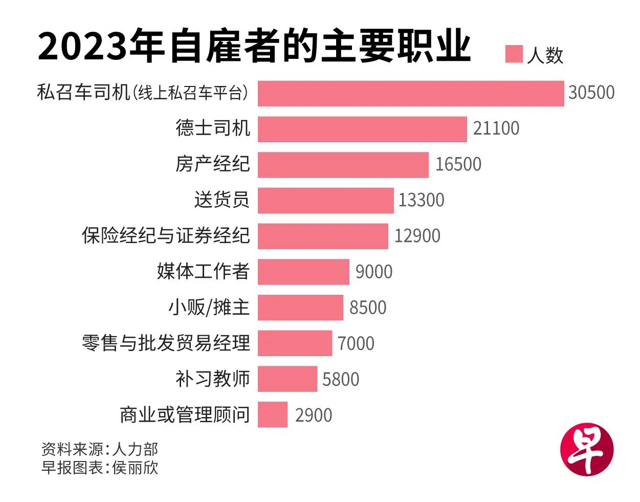 根据报告,本地自雇居民多为私召车司机,人数约有3万零500人。报告说,疫情促使大量自雇居民加入线上叫车平台当私召车司机,使得这一职业自2020年以来,成为自雇居民的首选工作。