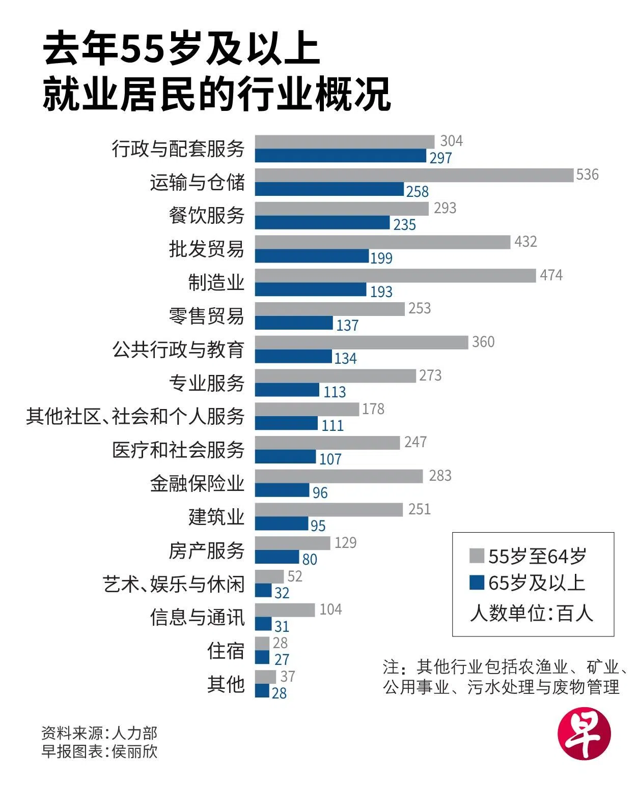 数据显示,65岁及以上的年长者,大多数从事行政与配套服务(如清洁工、保安员、园艺工人)、运输及仓储服务(如德士司机、私召车司机、巴士司机)与餐饮服务(如小贩或摊贩、厨房助理、食品或饮料摊位助理)工作。