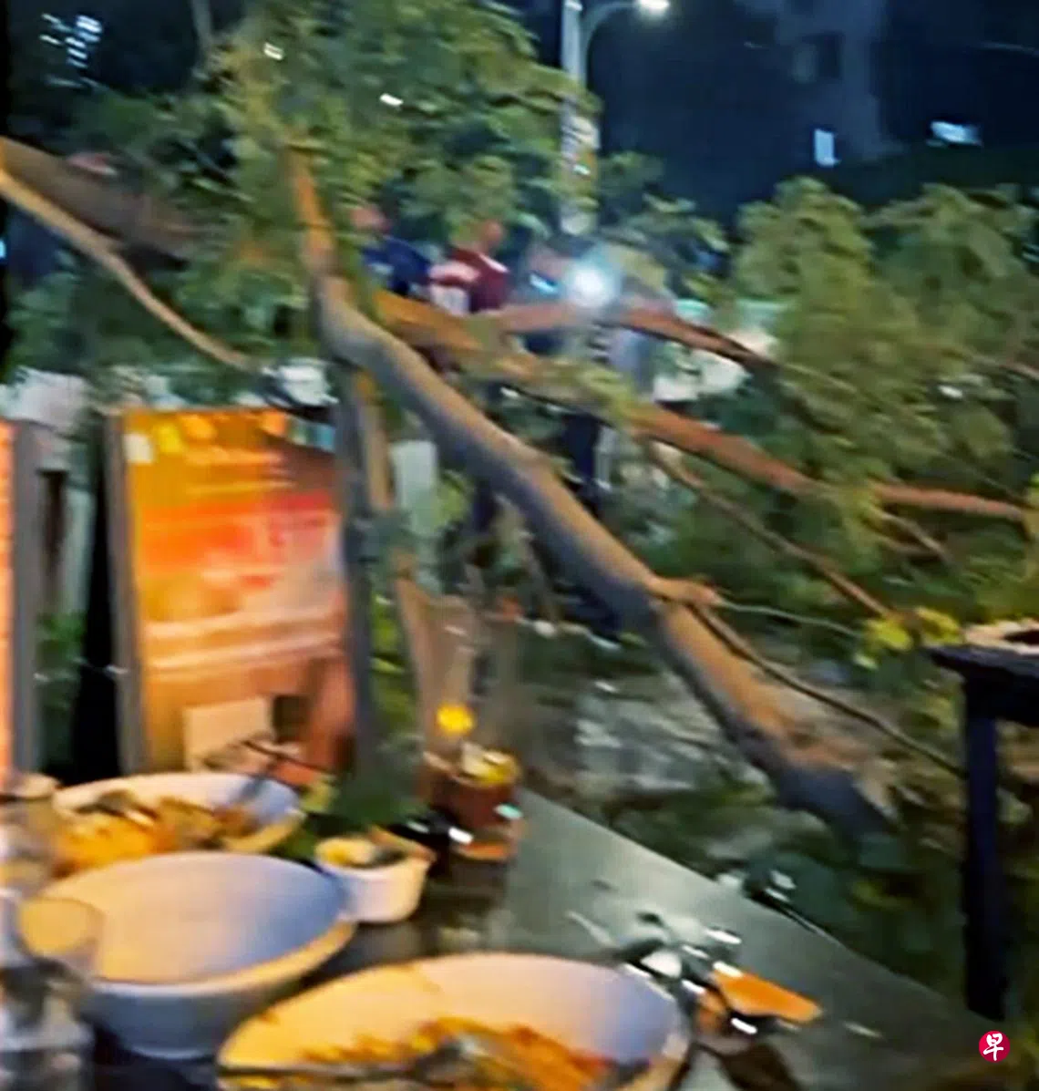 事发时,一段三至五米长的树枝从一棵大树上折断倒在路旁,也压中了餐厅的户外用餐区。