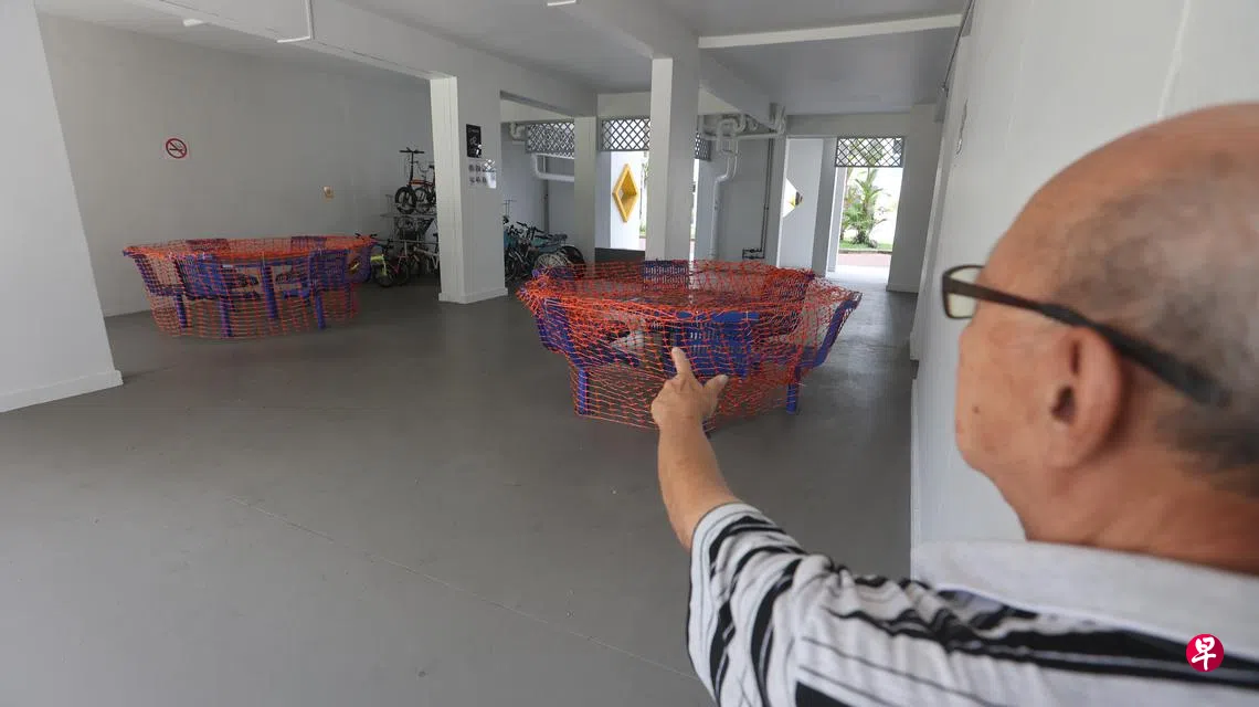 这起事故发生在宏茂桥3道第346座组屋,有居民申诉,楼下的公共桌椅被当局绑上了封锁网,让人感觉很不便。