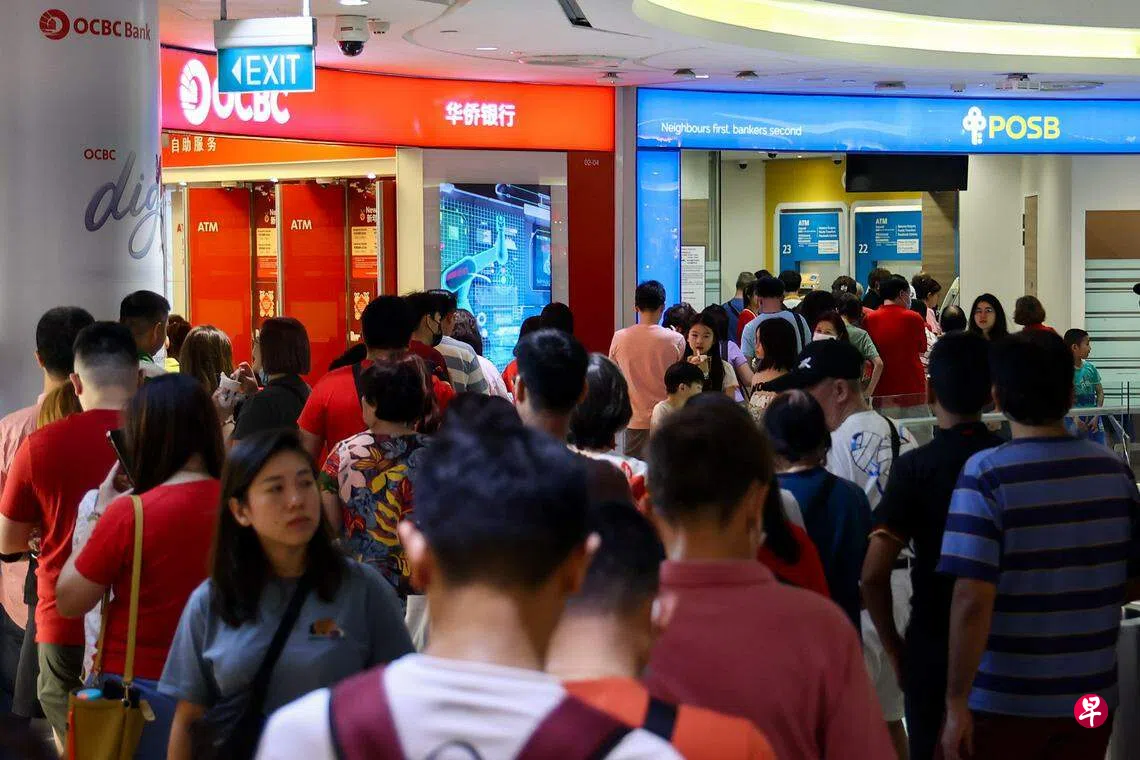 由于今年立春适逢星期天,银行没有营业,公众只能通过自动存款机存钱。位于盛港勘宝坊(Compass One)的华侨银行和储蓄银行,下午5时分别出现了长约70人和60人的列队。