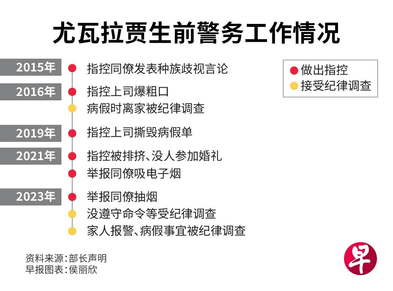 尤瓦拉贾在2014年加入警队直到2023年,九年多来作出四大指控,即受上司和同僚种族歧视或霸凌、同僚的不当行为被掩盖、遭到不公平对待影响绩效评估,以及被同僚排挤,但大部分指控都不成立,而属实的指控则已采取行动处分涉事警员。