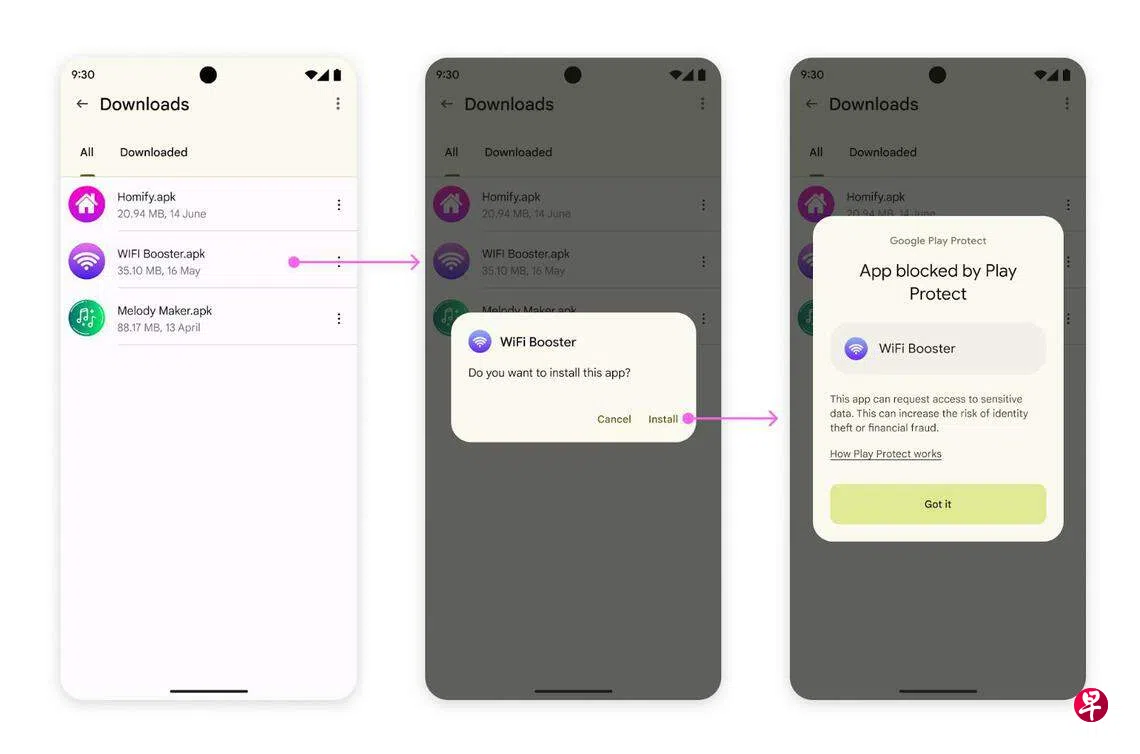 为避免用户成为诈骗案的受害者,有了这项新功能后,当用户尝试从网络浏览器、通讯软件应用,或者文件管理平台下载具有潜在风险的应用时,谷歌的“Play保护机制”(Play Protect)只要侦测到这些应用经常被滥用来欺诈,便会自动阻止应用的下载,并向用户解释。