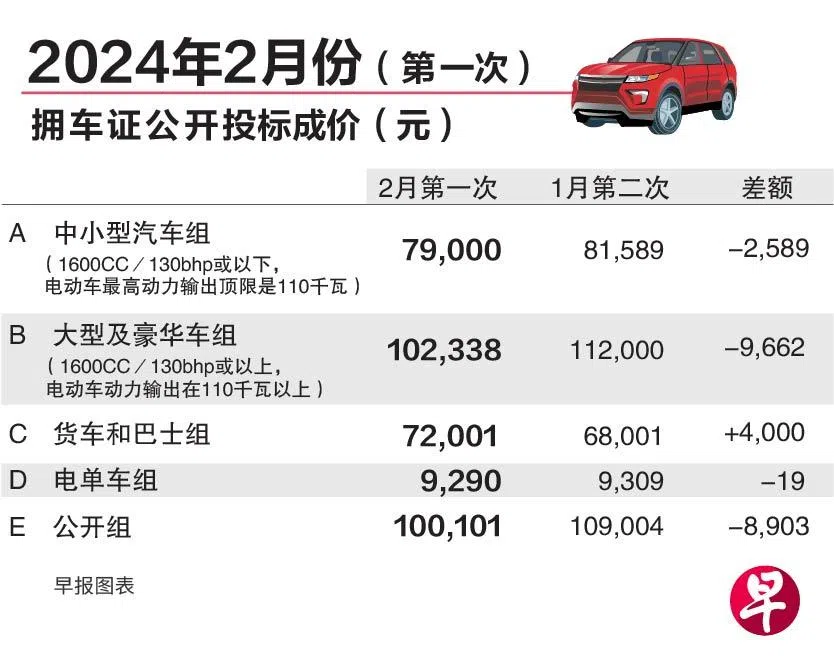 今年2月至4月的拥车证配额稍有增加,加上要在农历新年前交车的压力不再,中小型车、大型及豪华车等组别的拥车证成价皆下跌。不过,货车和巴士的成价攀升至7万2001元,是唯一上涨的组别。