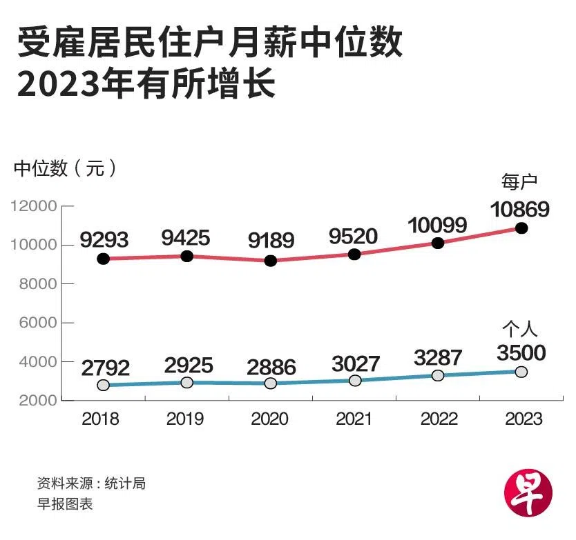 新加坡统计局星期三(2月7日)公布的《2023年住户收入主要趋势》报告显示,本地受雇居民住户的工作月入中位数,从前年的1万零99元,增长至去年的1万零869元,涨幅为7.6%。若计入通货膨胀,实际月入中位数同比增长2.8%,前年的同比实际增长仅0.2%。