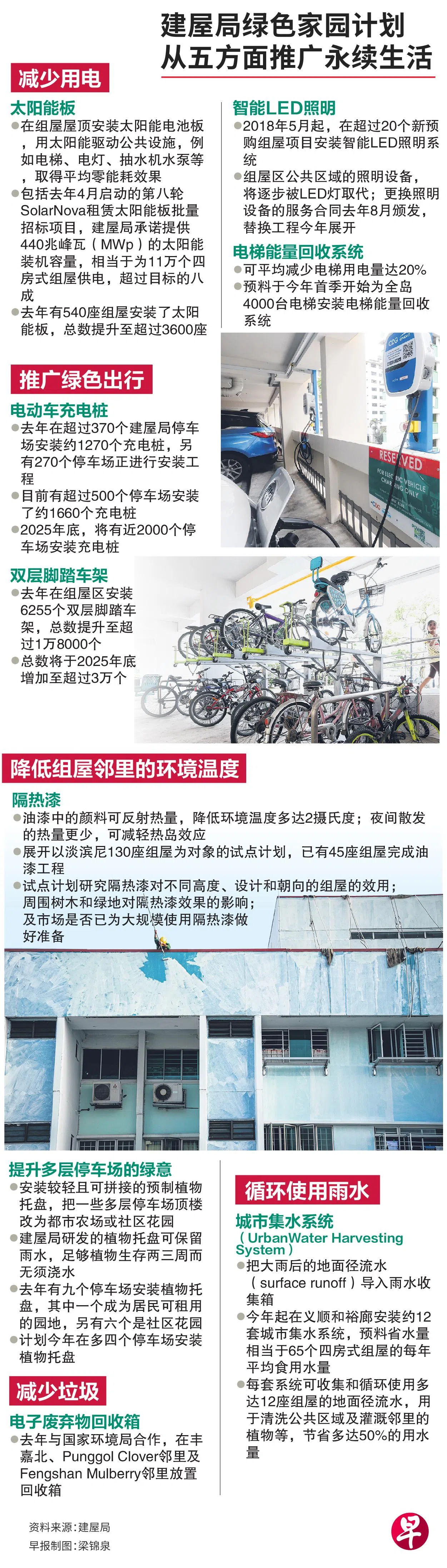 计划分五大方面,分别是减少用电、降低组屋邻里的环境温度、循环使用雨水、推广绿色出行及减少垃圾。