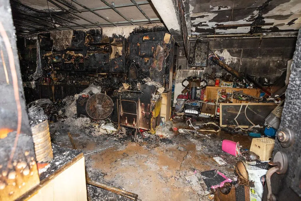 大火烧毁了客厅内的物品,民防人员用一支水枪将火势扑灭。