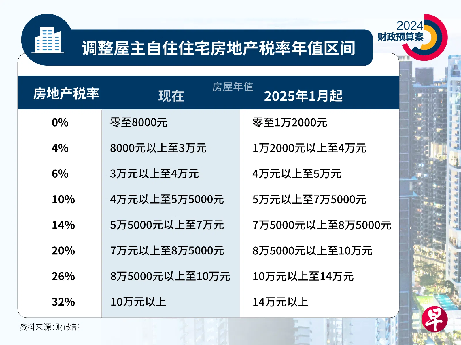 从2025年1月1日起,所有屋主自住的住宅房地产税率年值区间(annual values band)将调整。每个区间的上限都调高,以更好地反映租金上涨所推高的房产年值。各年值区间的屋主,预计会支付同样或较低的房地产税。